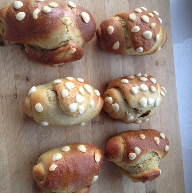 貌似不是很亮哟,,不过我加啦杏仁,里面卷的是葡萄干,吃着不错,,