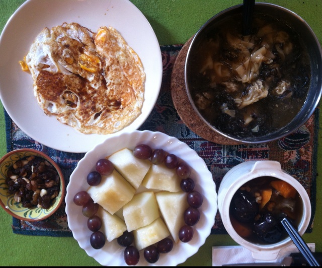 牛肉小馄饨+红薯银耳薏仁汤+鸡蛋+水果+坚果〜