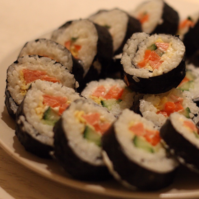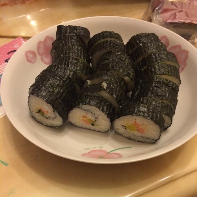 第一次做寿司。晚饭后,因为剩了很多米饭,所以我硬着头皮开始做寿司,材料是早就买好的,一直懒...