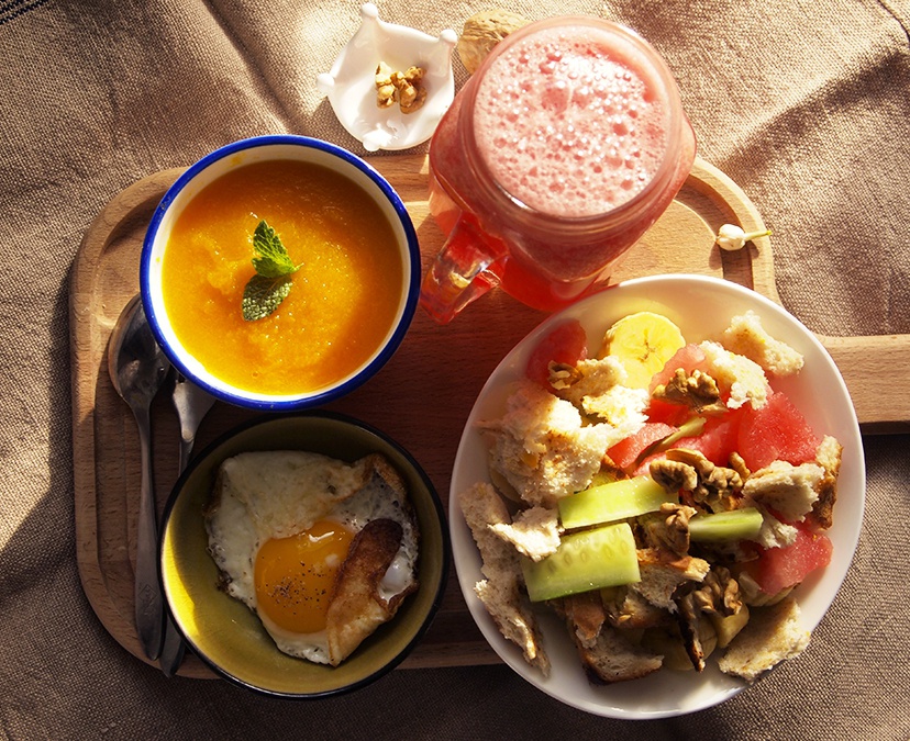 今天很丰富啊,煎鸡蛋,蒸南瓜,西瓜汁,还有面包碎沙拉,放了些核桃。好吃极了,吃了...