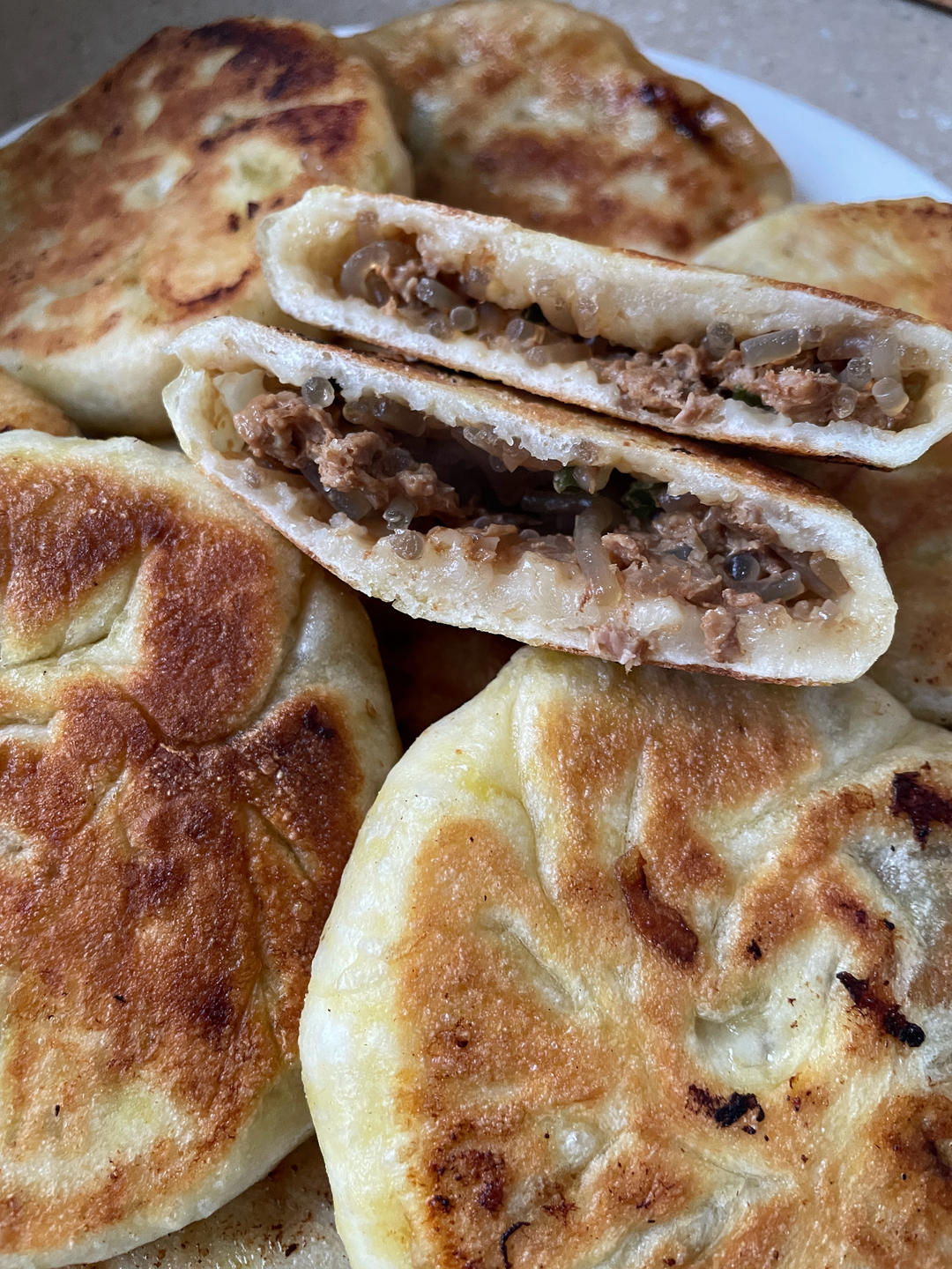 发面牛肉饼,刚出锅的时候外面焦黄酥脆,内里汁水丰富
