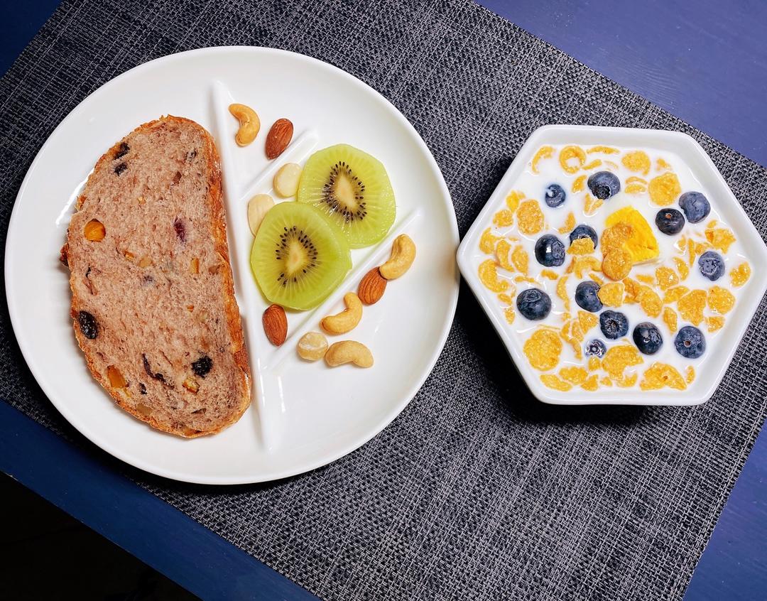 橙皮欧包+玉米片泡牛奶+坚果+蓝莓🥝