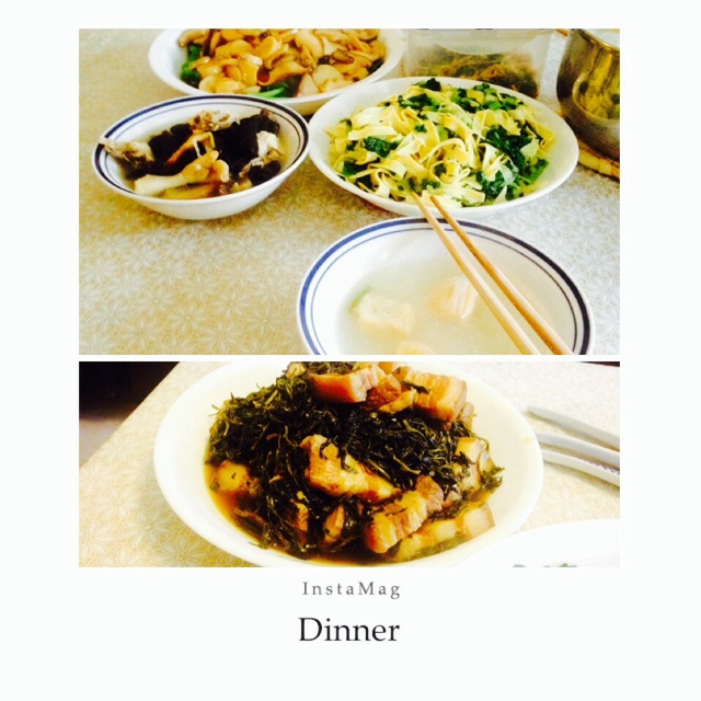 粉丝鱼豆腐汤,马兰头烧五花肉,雪菜烧百叶,皇子菇菜芯。在老公家里吃的哦。清淡美味。