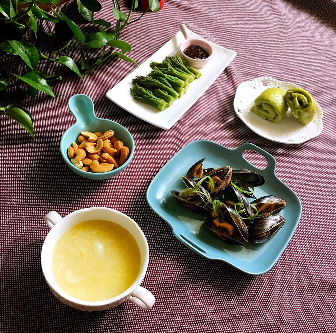 周末的早晨🌹早餐跑D14天:坚持到今天✊因为要出去游玩匆忙间竟然忘记了在规定时间上传😰菠菜汁木耳卷、白灼青口贝、刺嫩芽蘸...