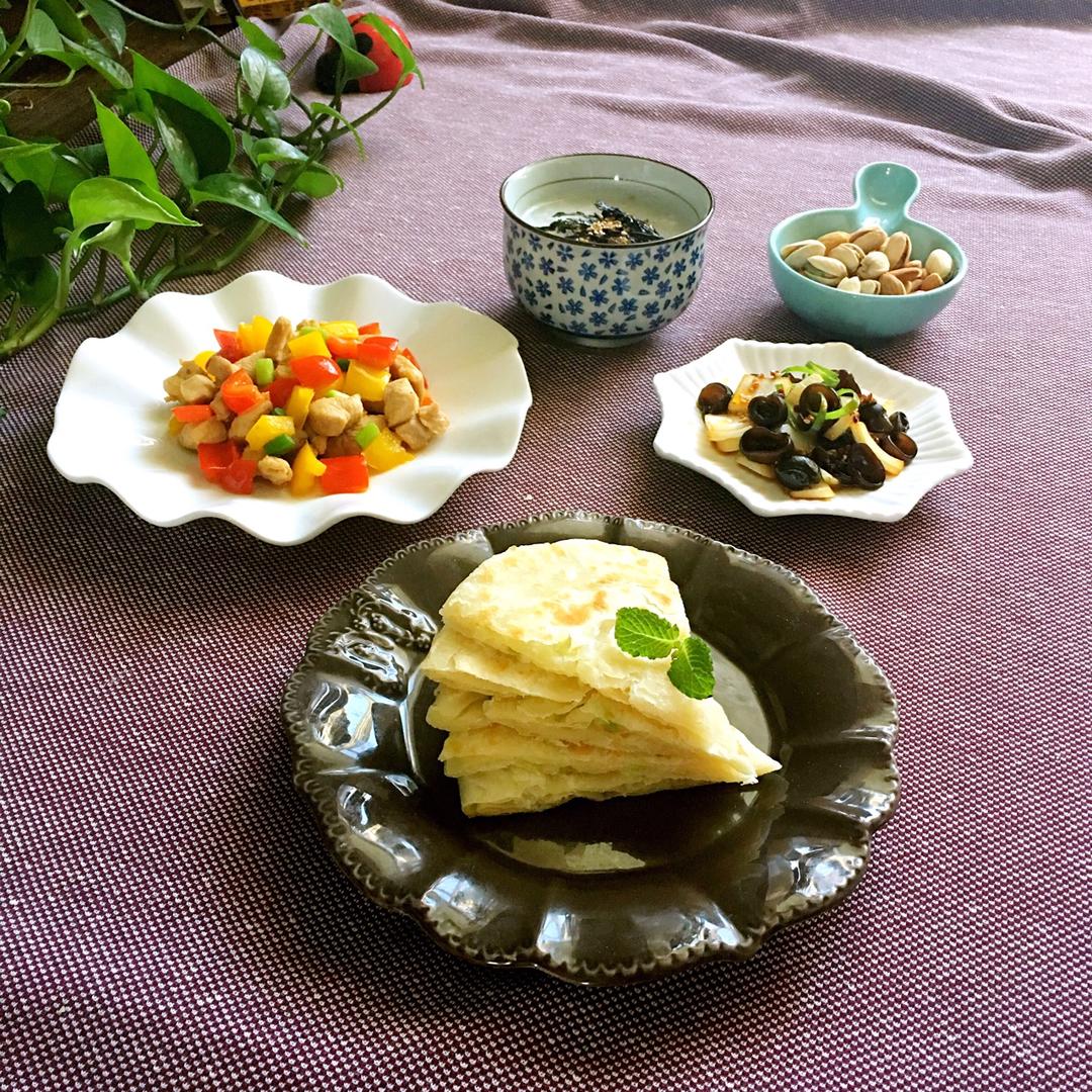 猫宁🌹早餐跑D13天:葱油饼、彩椒炒鸡丁、洋葱拌木耳菜、白粥海苔~✊