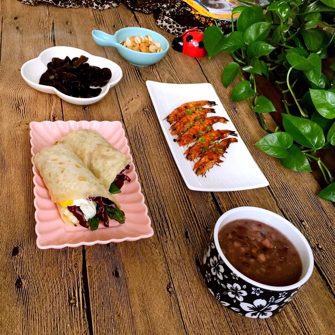猫宁🌹早餐跑已经到了尾声✊杂蔬鸡蛋卷饼、香煎海虾、糖醋木耳、杂粮粥