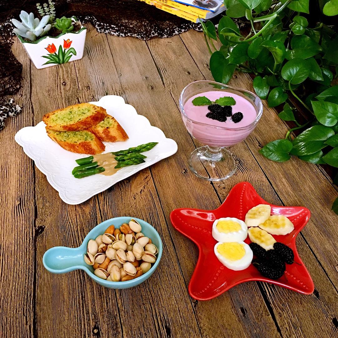 厨友们早🌹今日早餐:蒜香法棍、麻酱芦笋、桑葚酸奶、白煮蛋