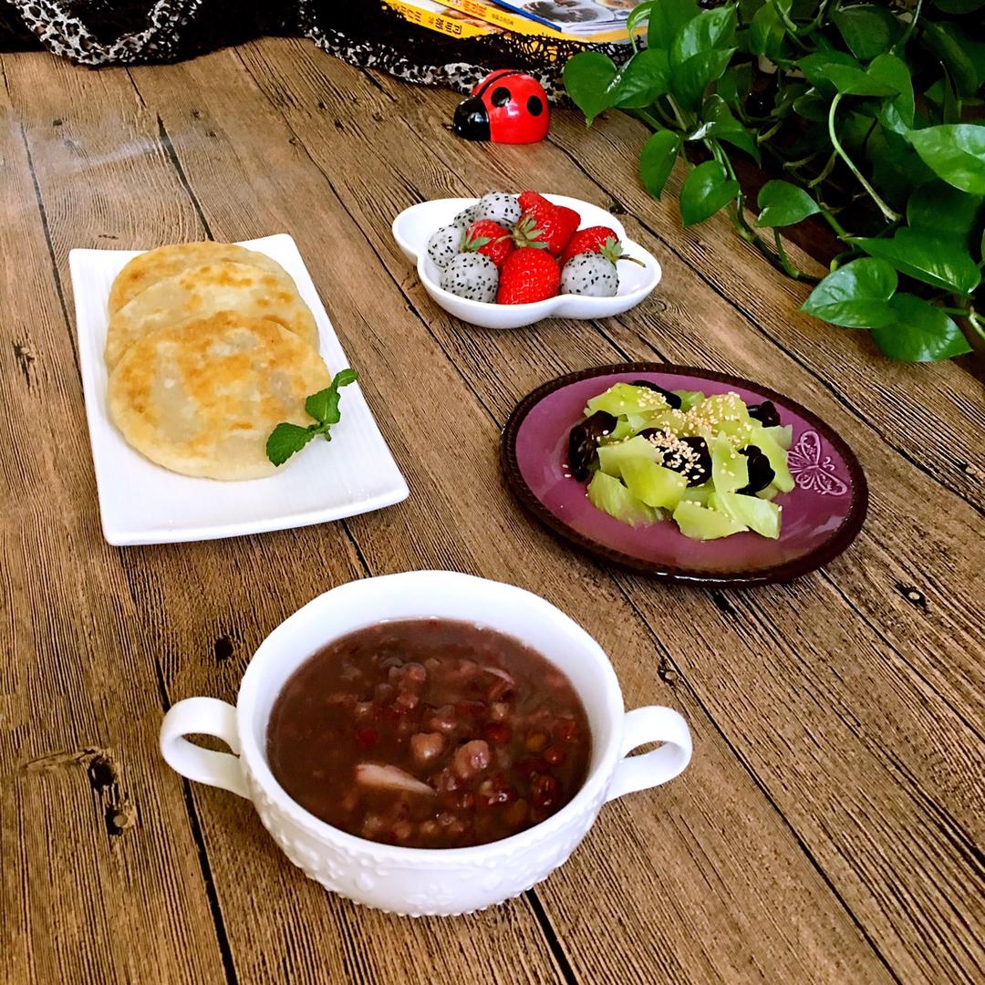 猫宁🌹早餐跑D18天:猪肉圆椒馅饼、杂粮粥、凉拌木耳莴苣、水果