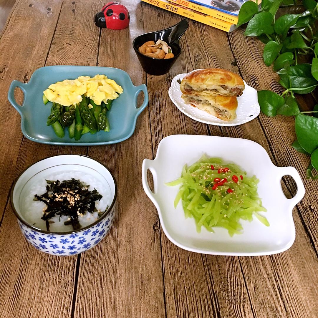 猫宁🌹早餐跑D16天:香酥牛肉饼、蛋奶芦笋、凉拌莴笋丝、白粥海苔✊