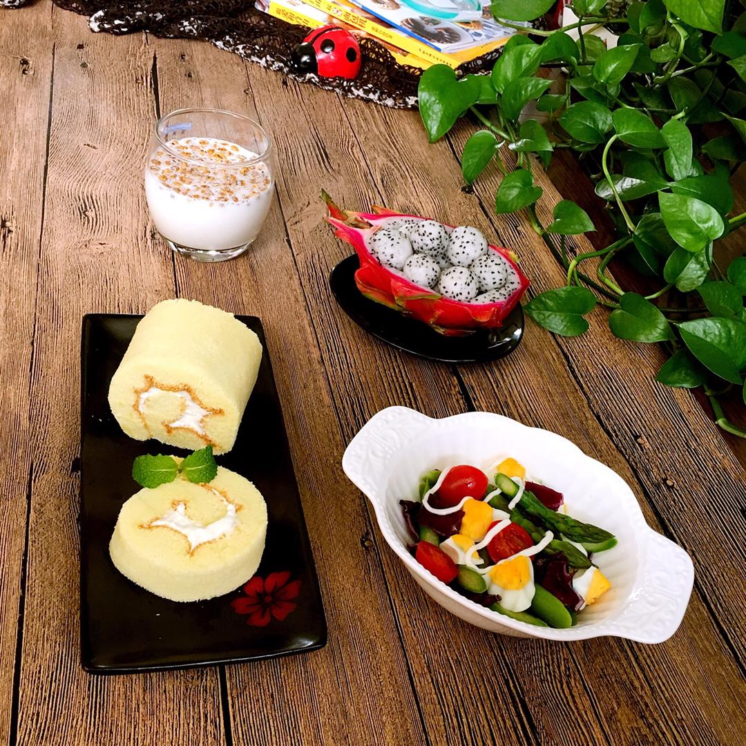猫宁🌹早餐跑D17天:戚风蛋糕卷、什锦沙拉、牛奶麦片、水果