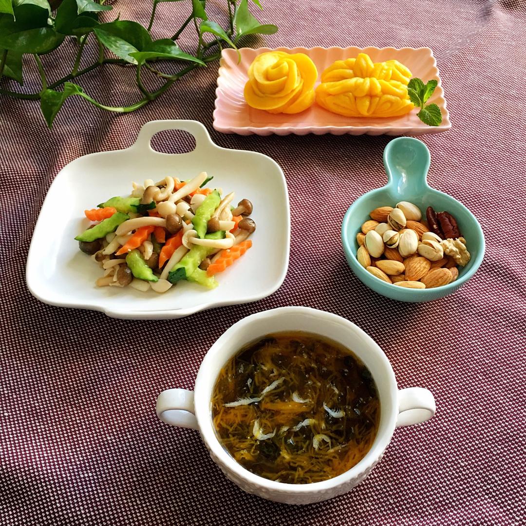 猫宁🌹早餐跑D11天:南瓜花色卷、蚝油炒双菇、金丝紫菜虾皮汤、干果
