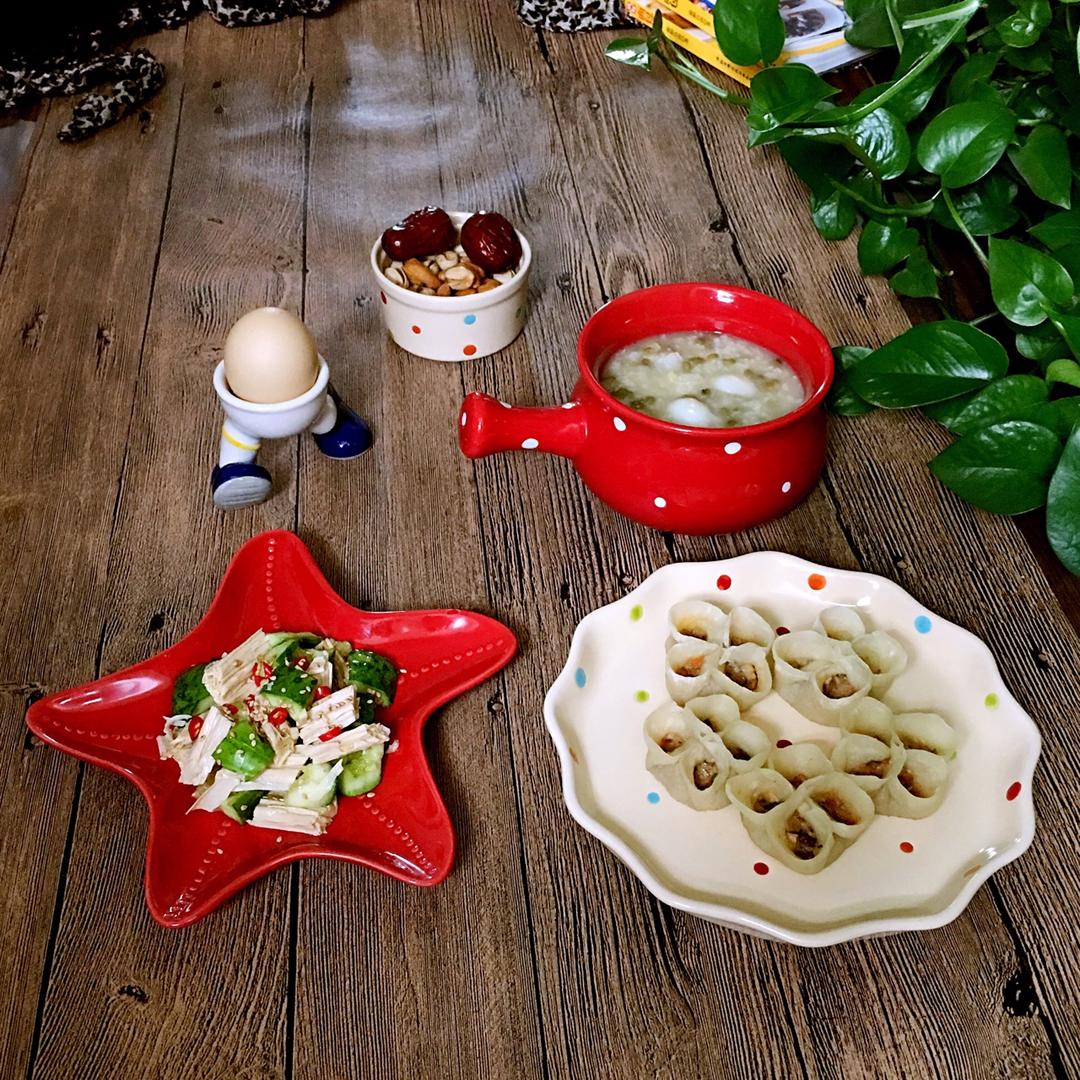 厨友们早🌹:花样四喜鲜肉生煎、腐竹拌黄瓜、大米绿豆百合粥、白煮蛋😋