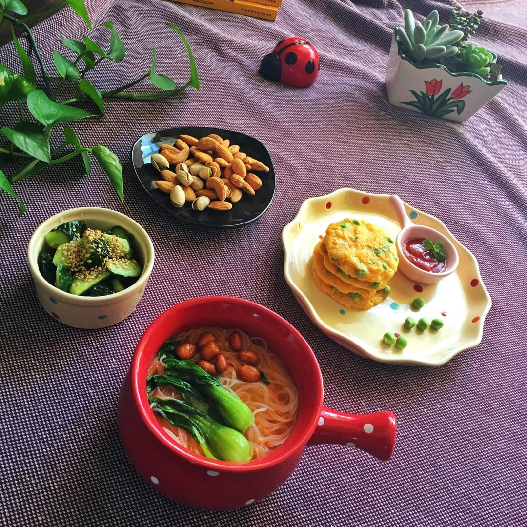 猫宁🌹早餐跑D15天:煎豌豆虾饼、爽口黄瓜、虾汤米线、干果