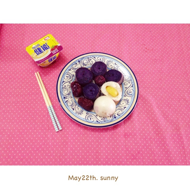 奶黄包+紫薯+红枣+酸奶。早上忘记传啦!今天天气很不错~