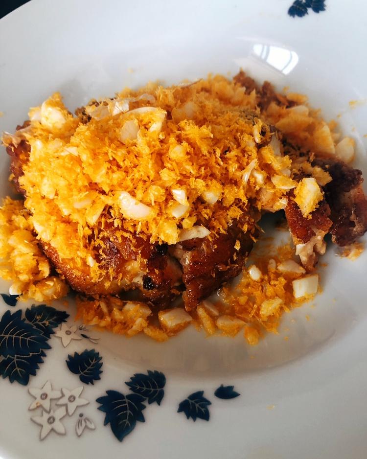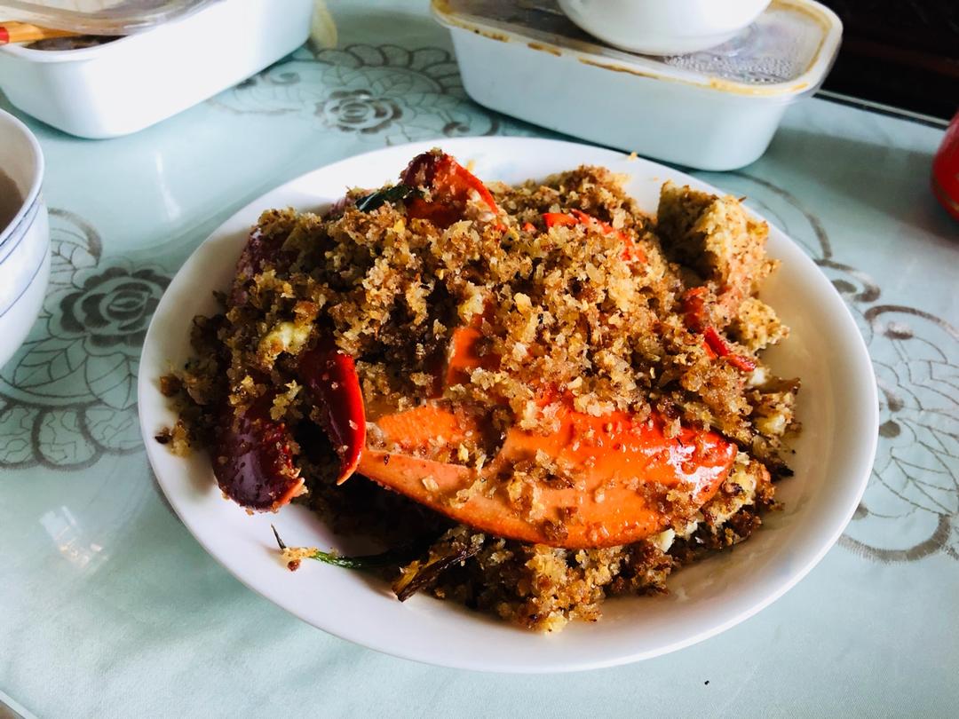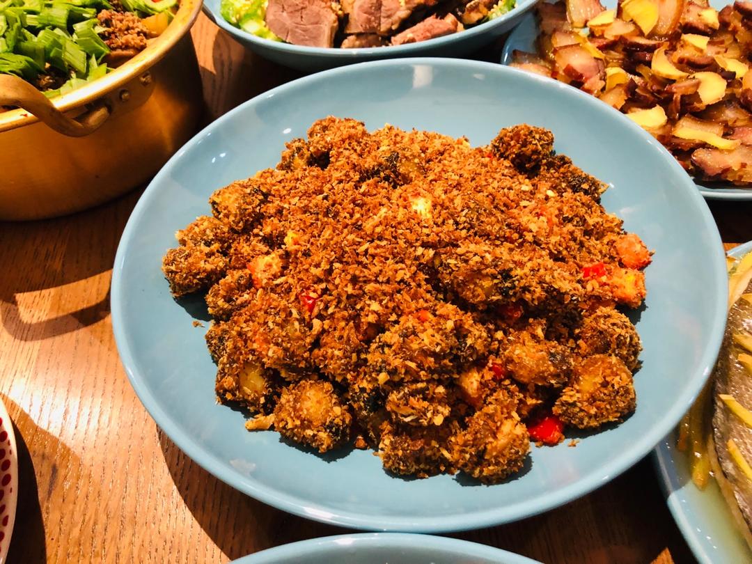 指导老妈做的。这次改良加了咸蛋黄,而且老妈加了很多蒜,面包屑的味道很赞。最后出锅忘记有咸蛋黄了,又加了点盐,稍微有点儿咸...