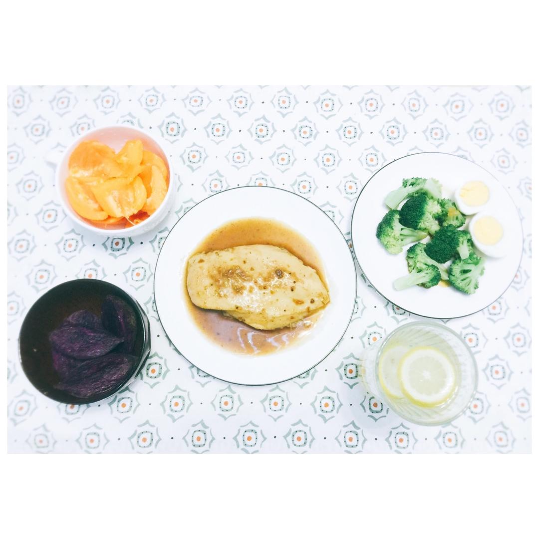 June | DAY 15 My fitness plate 33 水煎黑椒鸡胸肉+捞西兰花🥦+紫薯+木瓜+柠檬水🍋 有...
