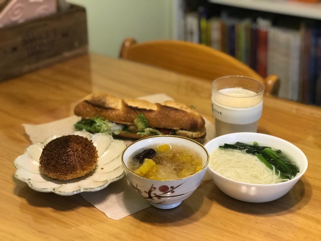今日份早餐:牛油果鸡胸肉法棍三明治,老鸭汤面,金银耳桃胶红枣汤,咖喱鸡肉包,焦糖奶茶