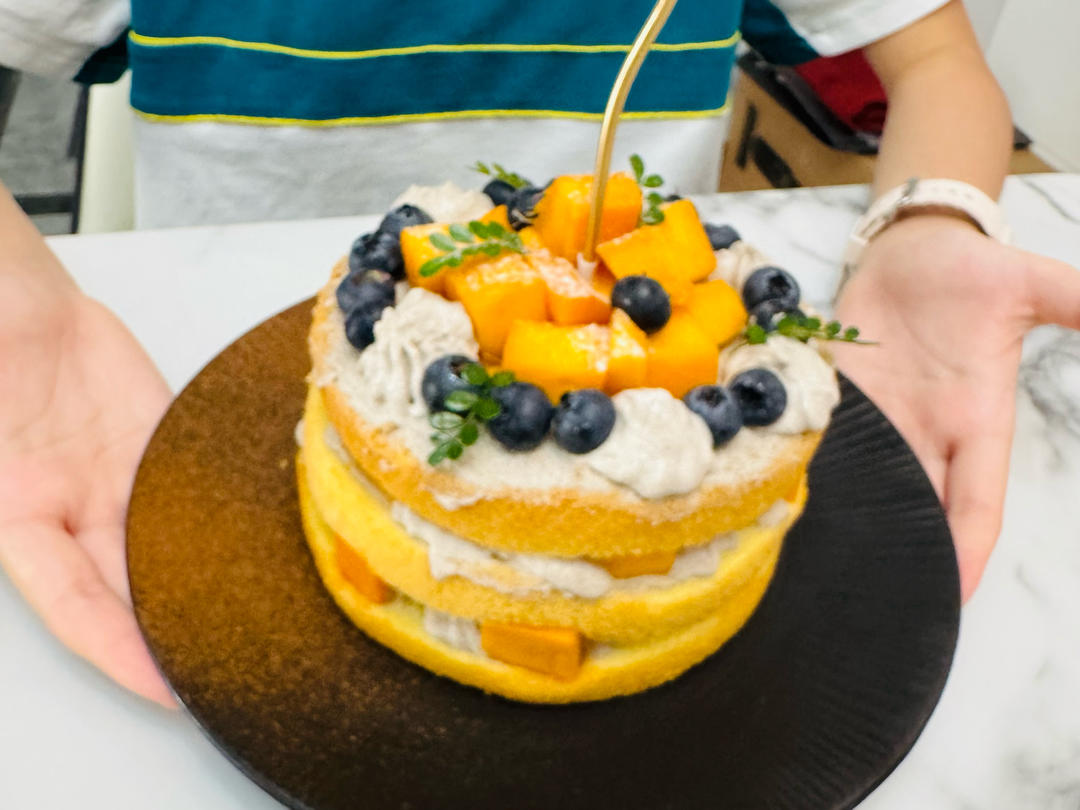 蛋糕中间加了芒果和蓝莓,装裱草莓为主蓝莓点缀,奶油用了总统牌,并没有网上说的难打发。奶味也是够的,是清淡型!白糖减至10...