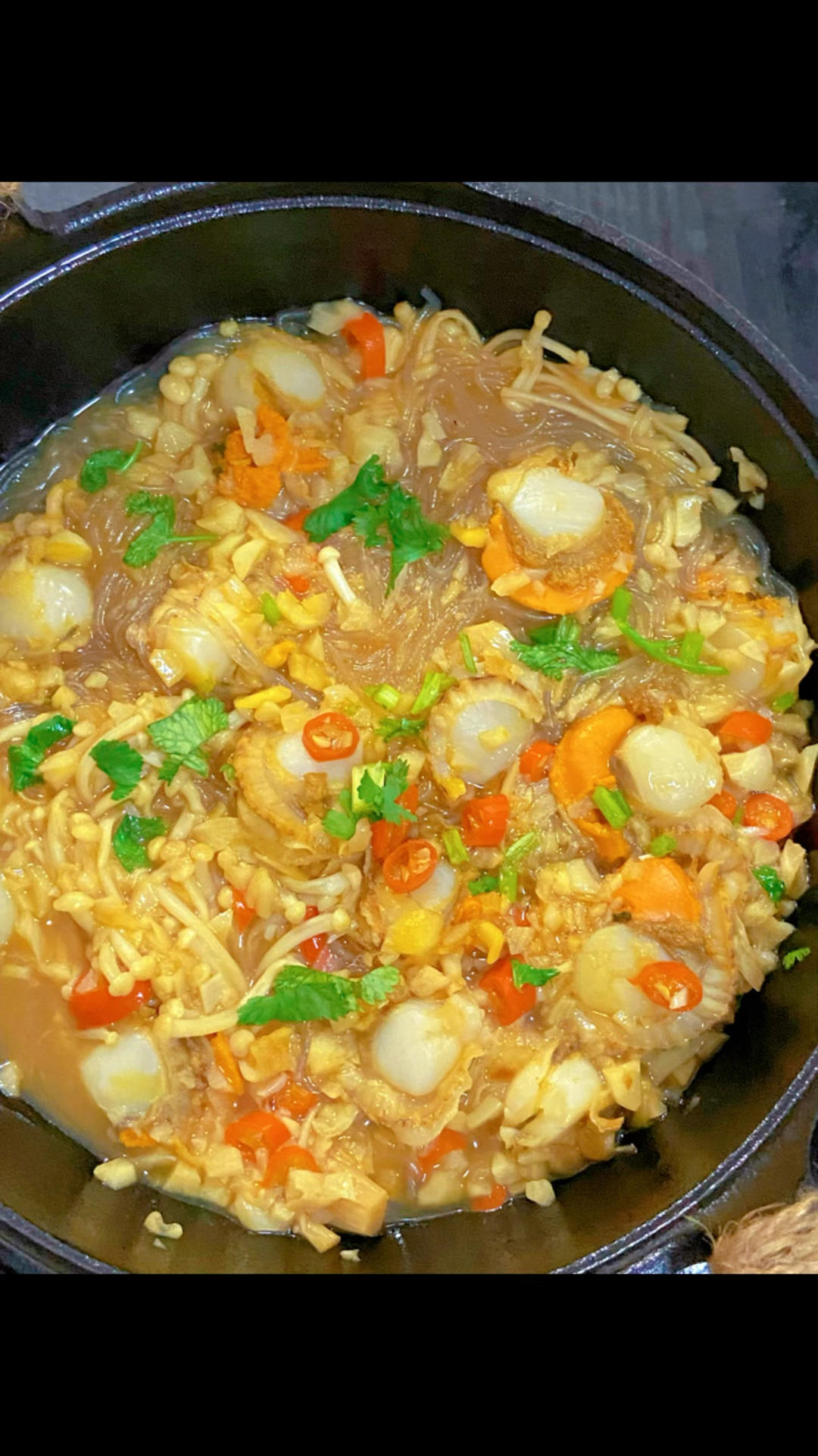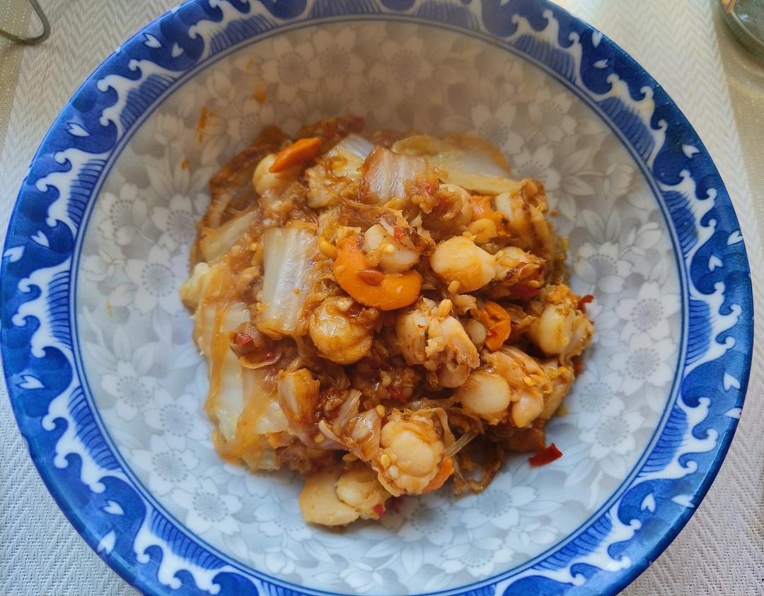 珐琅锅做的,层层铺上:白菜、粉丝、扇贝,放少量啤酒。