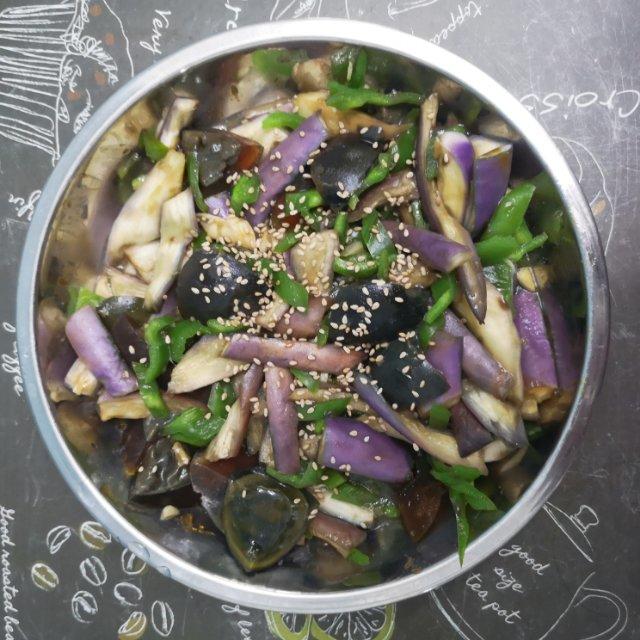 凉拌茄子青椒皮蛋:嫩茄子切条加点盐蒸熟,青椒皮蛋切块,加蒜末蚝油酱油橄榄油(香油)拌匀,撒上芝麻,加葱花香菜(可选),开...