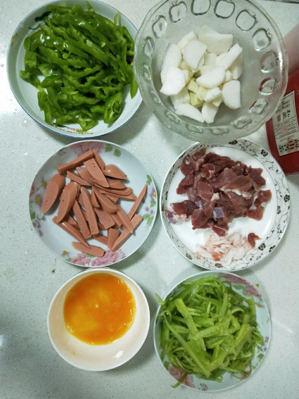 辣椒炒肉,黄瓜炒火腿,萝卜鸡蛋汤