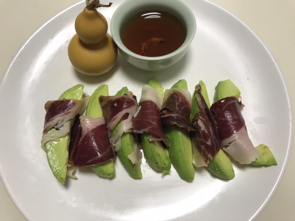 火腿配牛油果,咀嚼后喝口黄酒,那味道超级幸福。