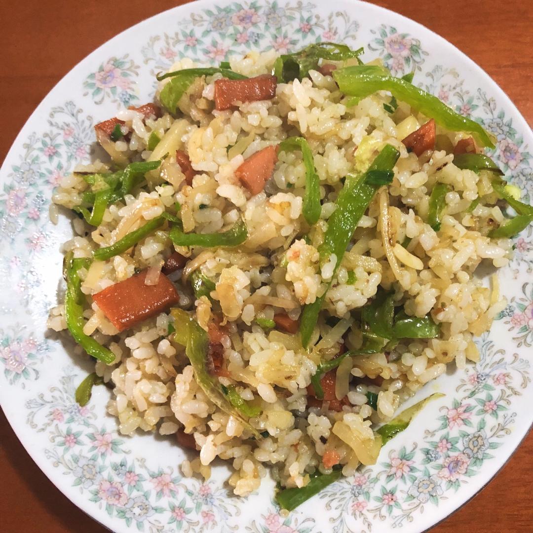 用的剩下的青椒土豆丝加了点火腿炒的饭,好吃😋