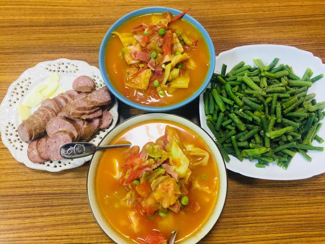 番茄烩白菜,可能是我们家的主打菜了,以这为基底可以加火腿香肠牛肉海鲜等一切蛋白质!