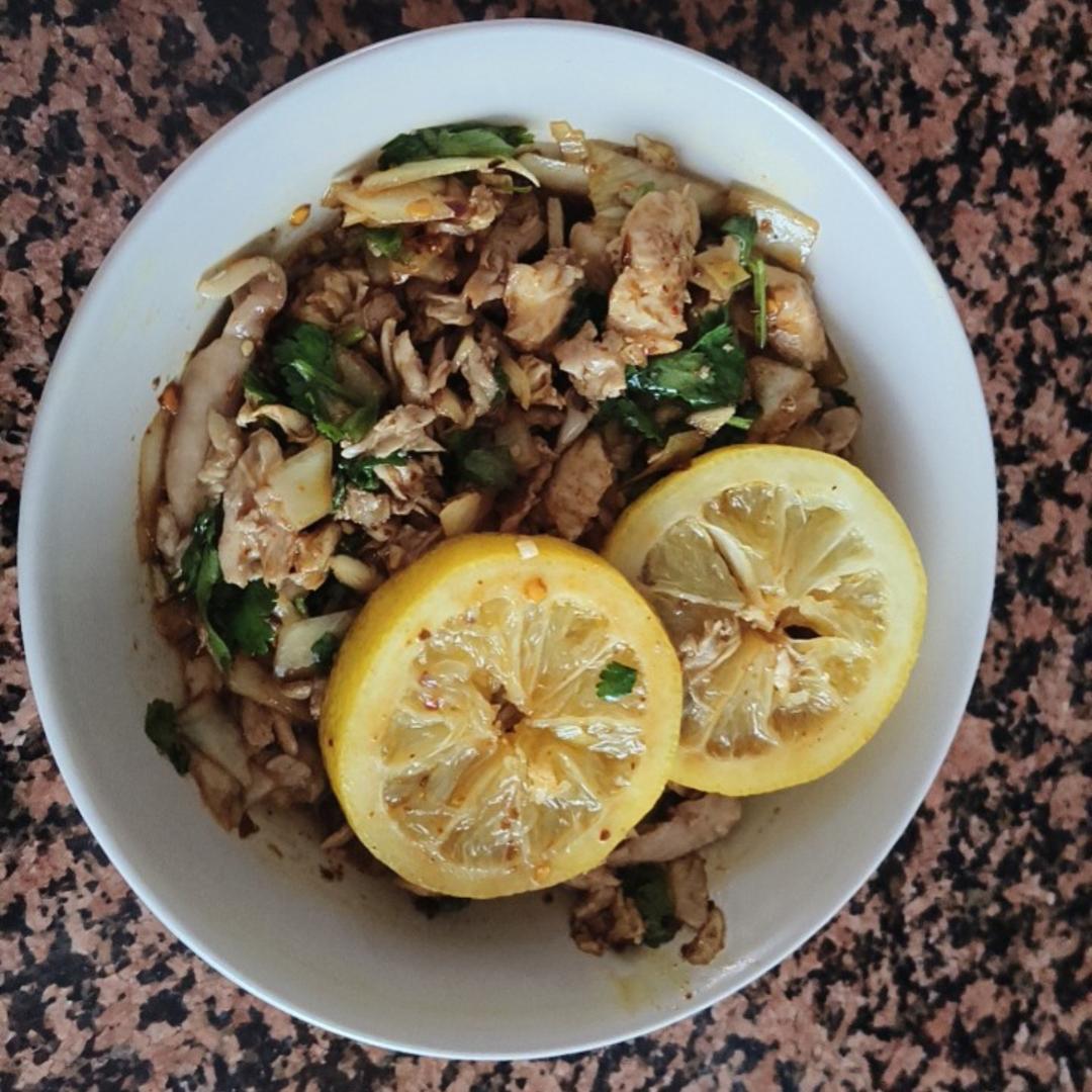 很喜欢柠檬 这道菜用了一整颗柠檬 图片上这两片柠檬只是简单挤了挤 剩余的柠檬把汁液全部挤到菜里了 非常好吃