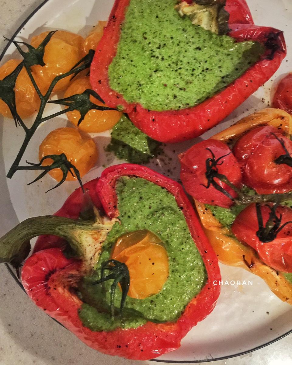 【第313天】烤彩椒 & 圣女果~ 搭配上Kale Pesto。彩椒和圣女果都是水分含量很高的食材,烤完烤盘上全...
