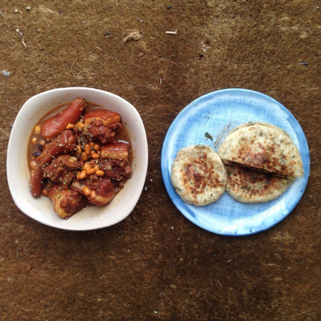 黄豆焖猪尾+馅饼,又是一顿。