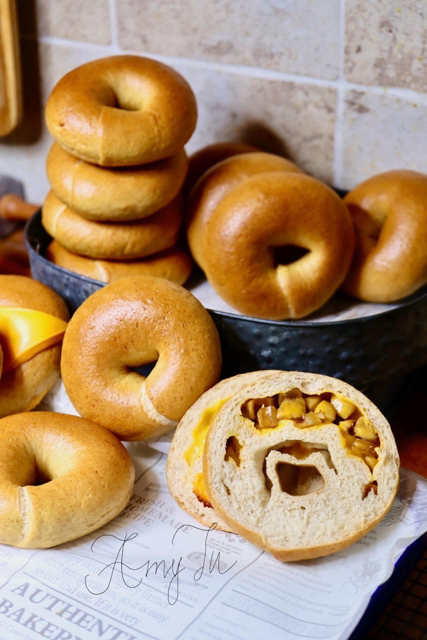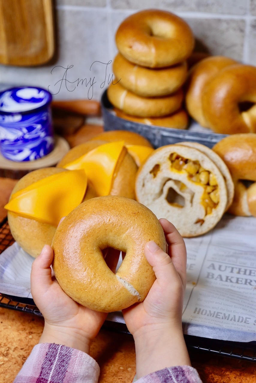 贝果口感扎实有嚼劲,面团含水量不高,这次面团里加了有麦麸的全麦...