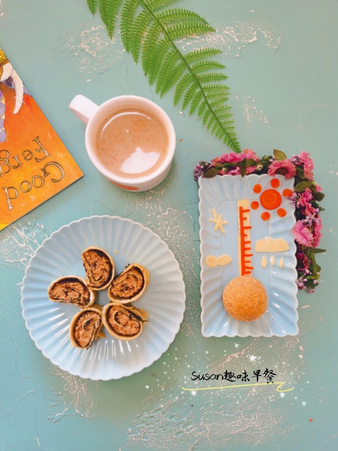 Susan趣味早餐第1456号,温度计,蔬菜海苔鸡肉蛋卷,南瓜咖啡。 小熊Libra 亲手制作的生酮低卡餐包,太好吃了。...