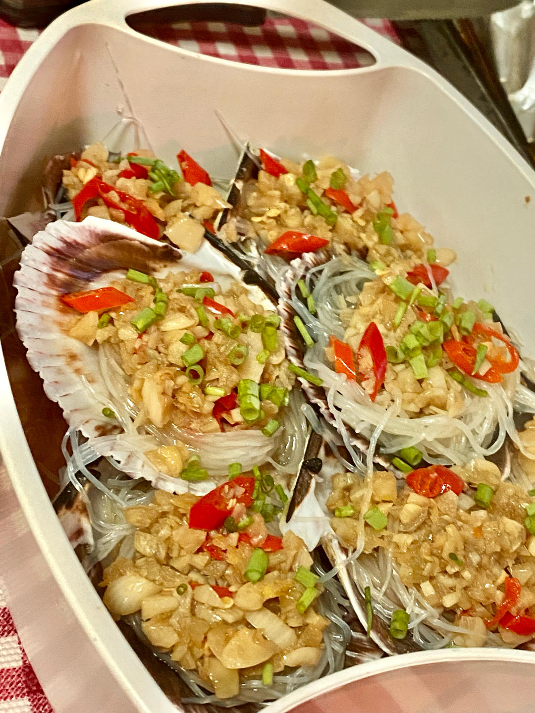六个大扇贝用了20粒蒜的蒜蓉,贝肉上放蒜蓉后没淋油,因为蒜蓉炒了有油,蒸好后撒了葱花,没再淋油,太美味了。 #蒜蓉粉丝蒸...
