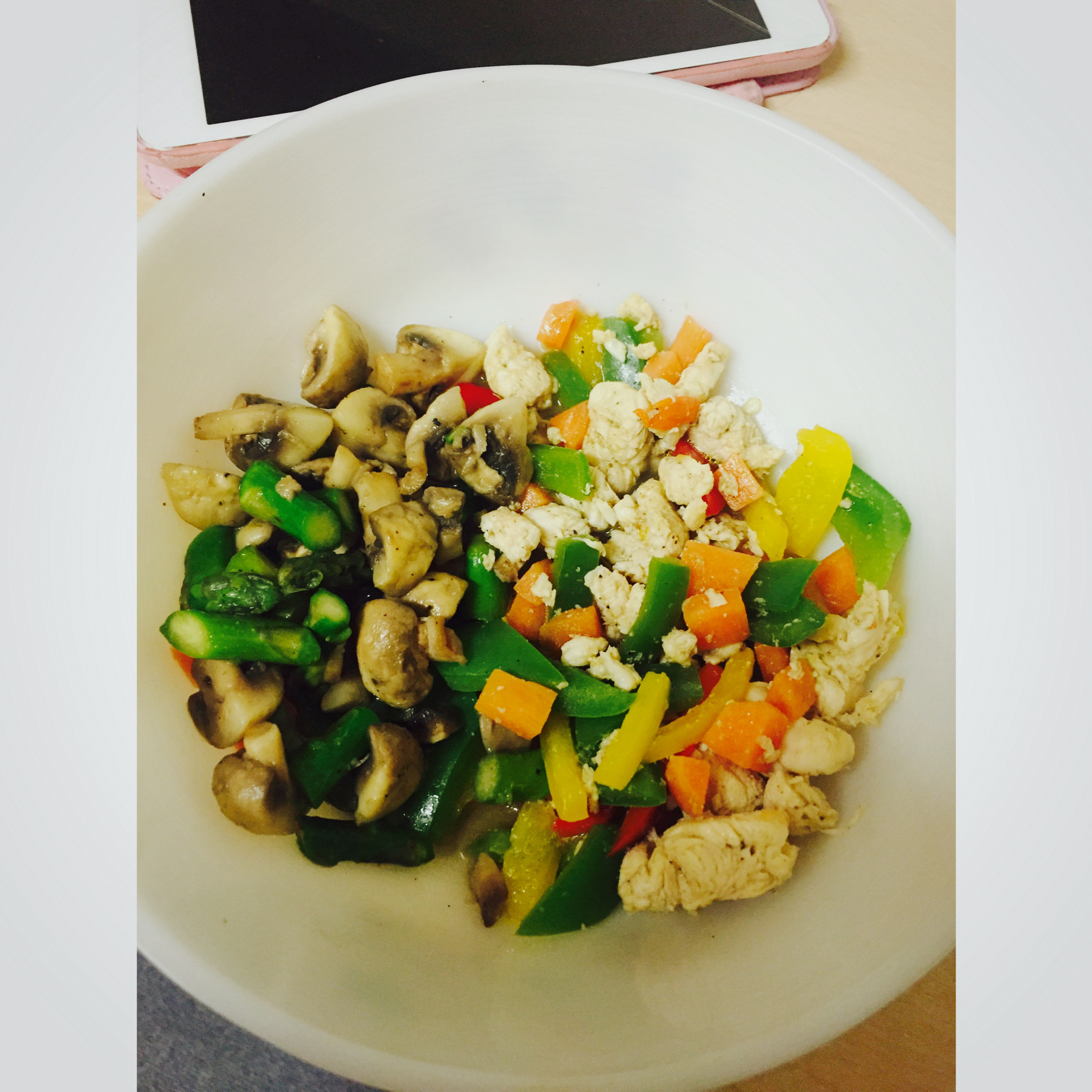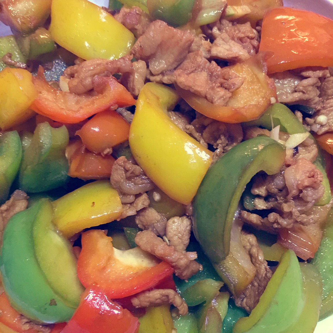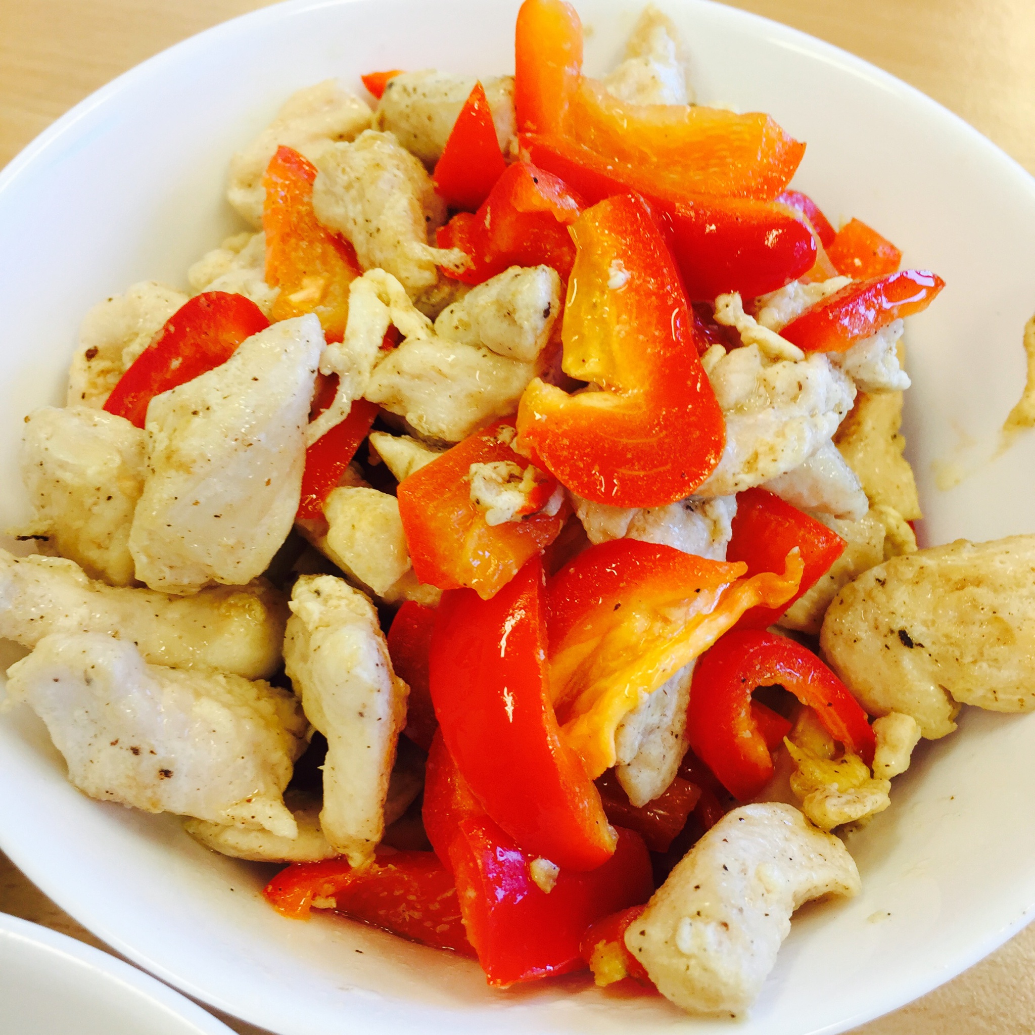 由于懒惰,只有一种颜色的彩椒!由于刀工烂,鸡丁并不是鸡丁!我放了胡椒粉!超美味的!