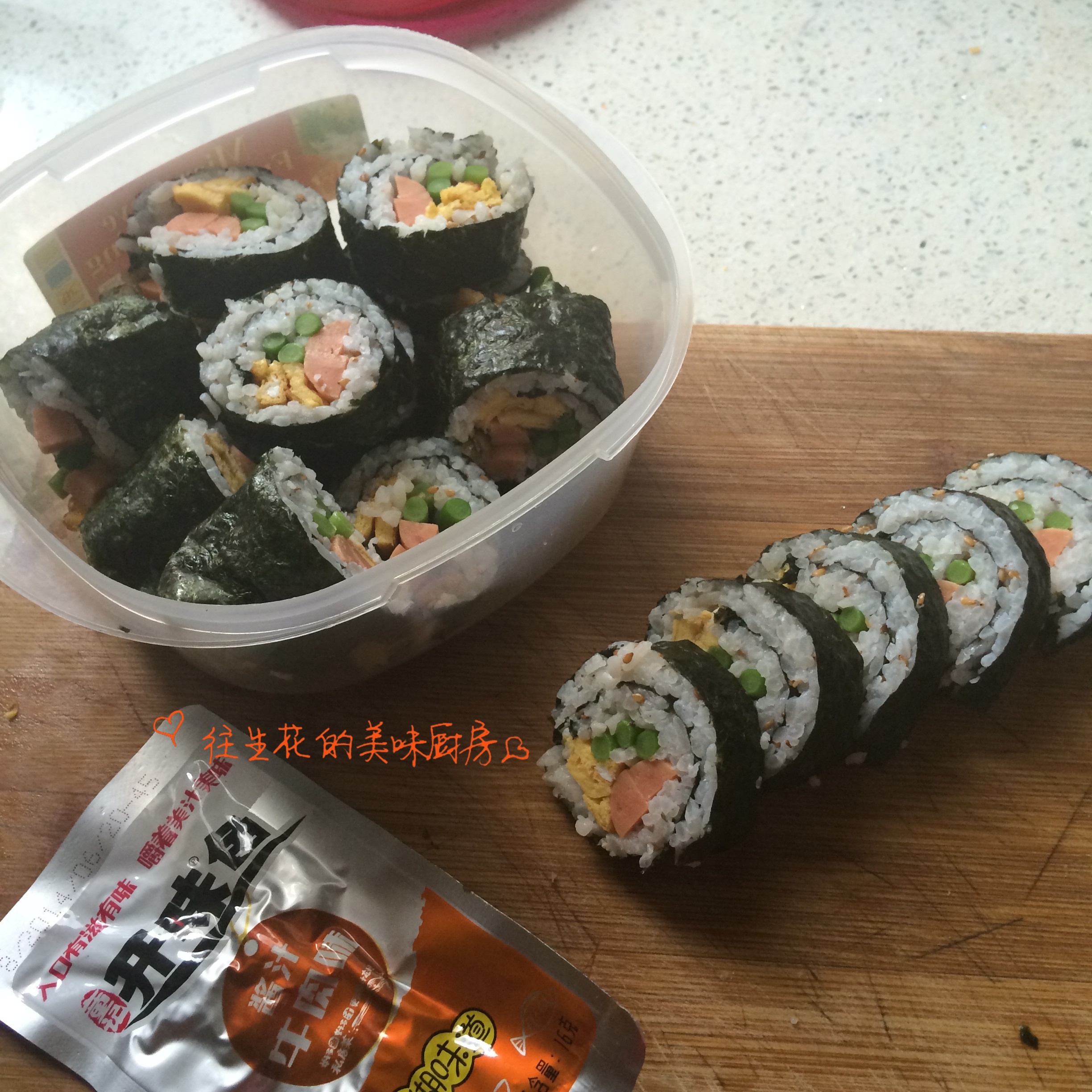 明天开车去四川,做了一个紫菜包饭的便当明天路上吃,放了小鱼干、蒜苔、火腿肠、鸡蛋。忙活了一上午,就为了吃^0^