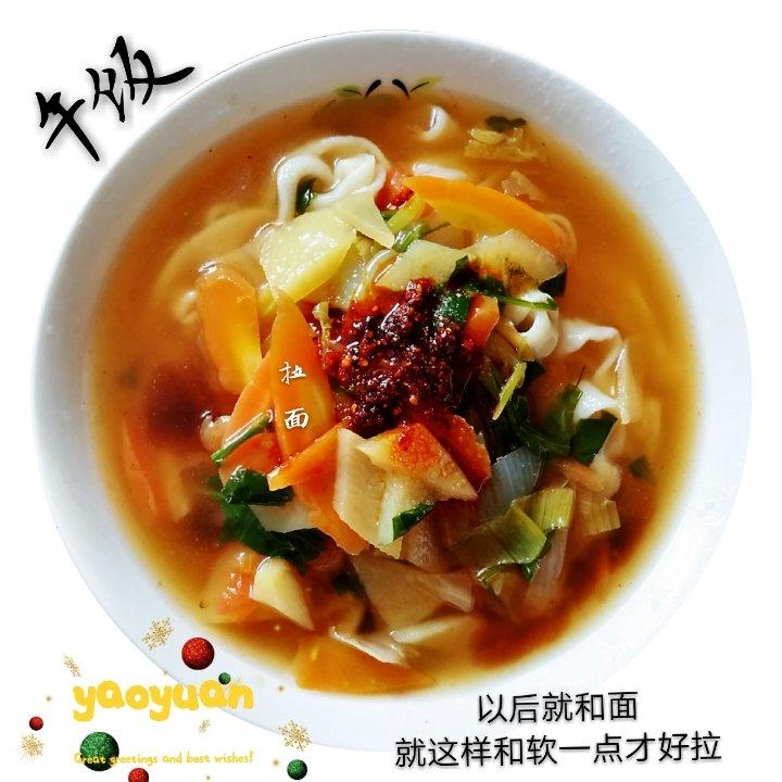 借楼存图,面团没过夜,所以只拉了宽条子。一次照你的方法试试。