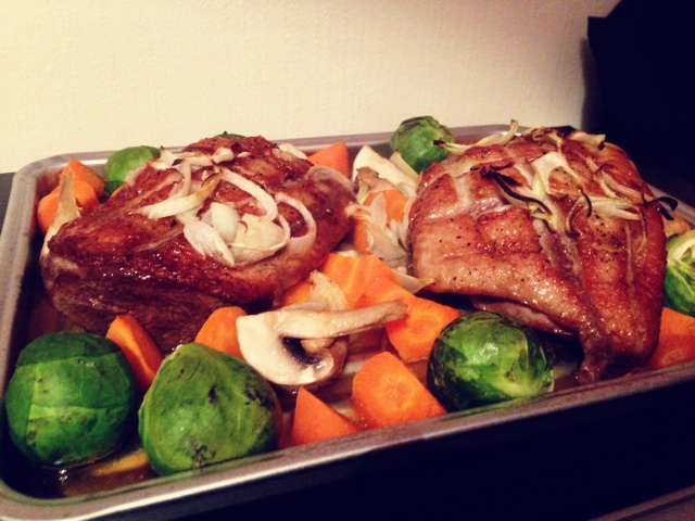 用煎鸭子出的油加点酱汁煎了蔬菜,超好吃。烤鸭子时加了点小洋葱。蔬菜用了胡萝卜、蘑菇和抱子甘蓝。 #晚餐•2014年11月...