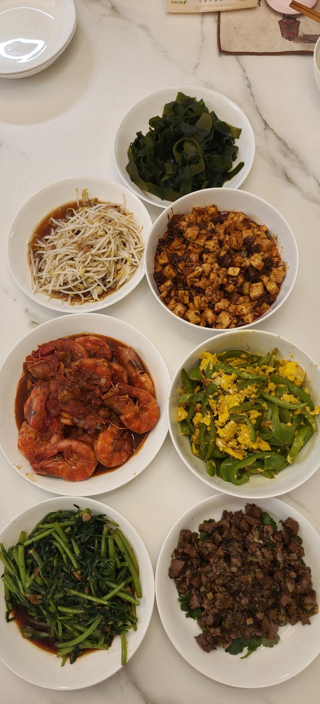 周日午餐:孜然羊肉粒,番茄大虾,麻婆豆腐,青椒鸡蛋,醋溜绿豆芽,海米茼蒿