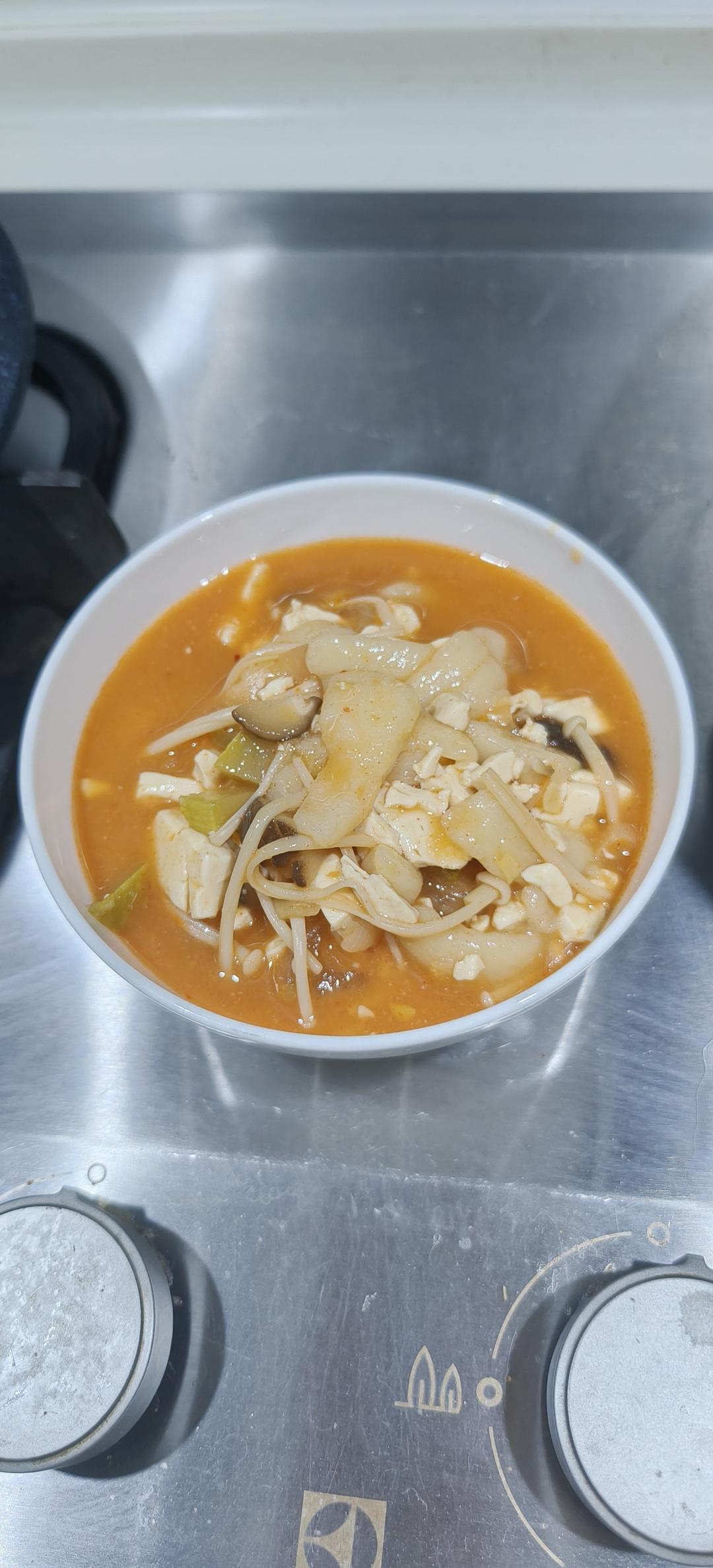 其实是早饭:昨天剩的泡菜年糕豆腐汤,用了一小包宗家府泡菜,西葫芦洋葱豆腐香菇金针菇,还有切碎的年糕片,陈年老韩式辣酱,果...