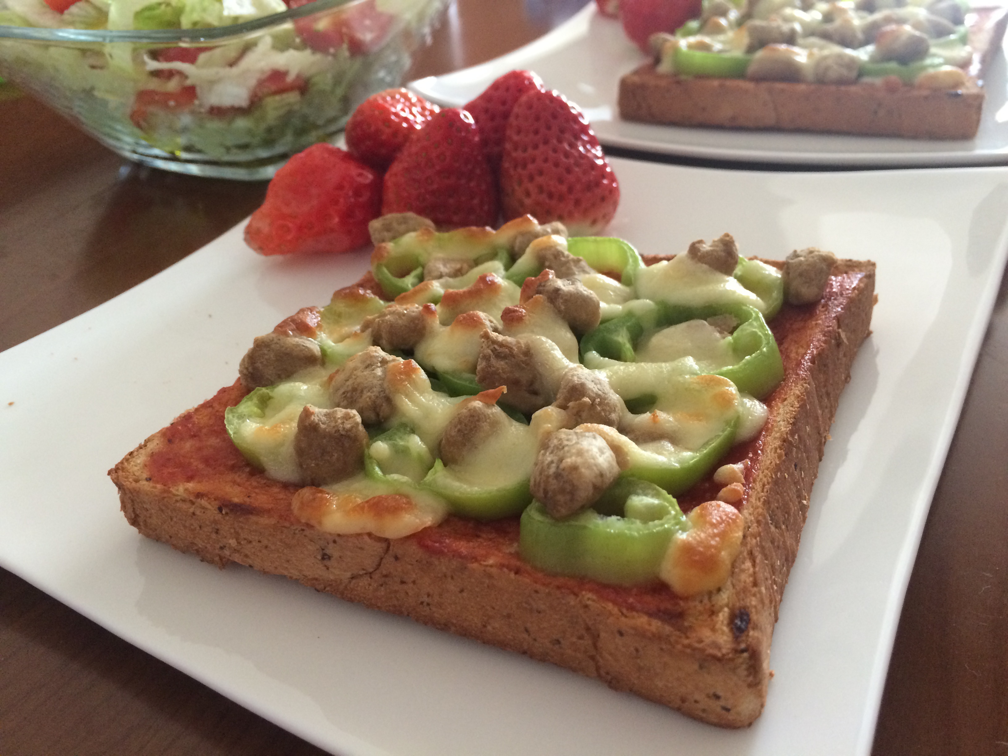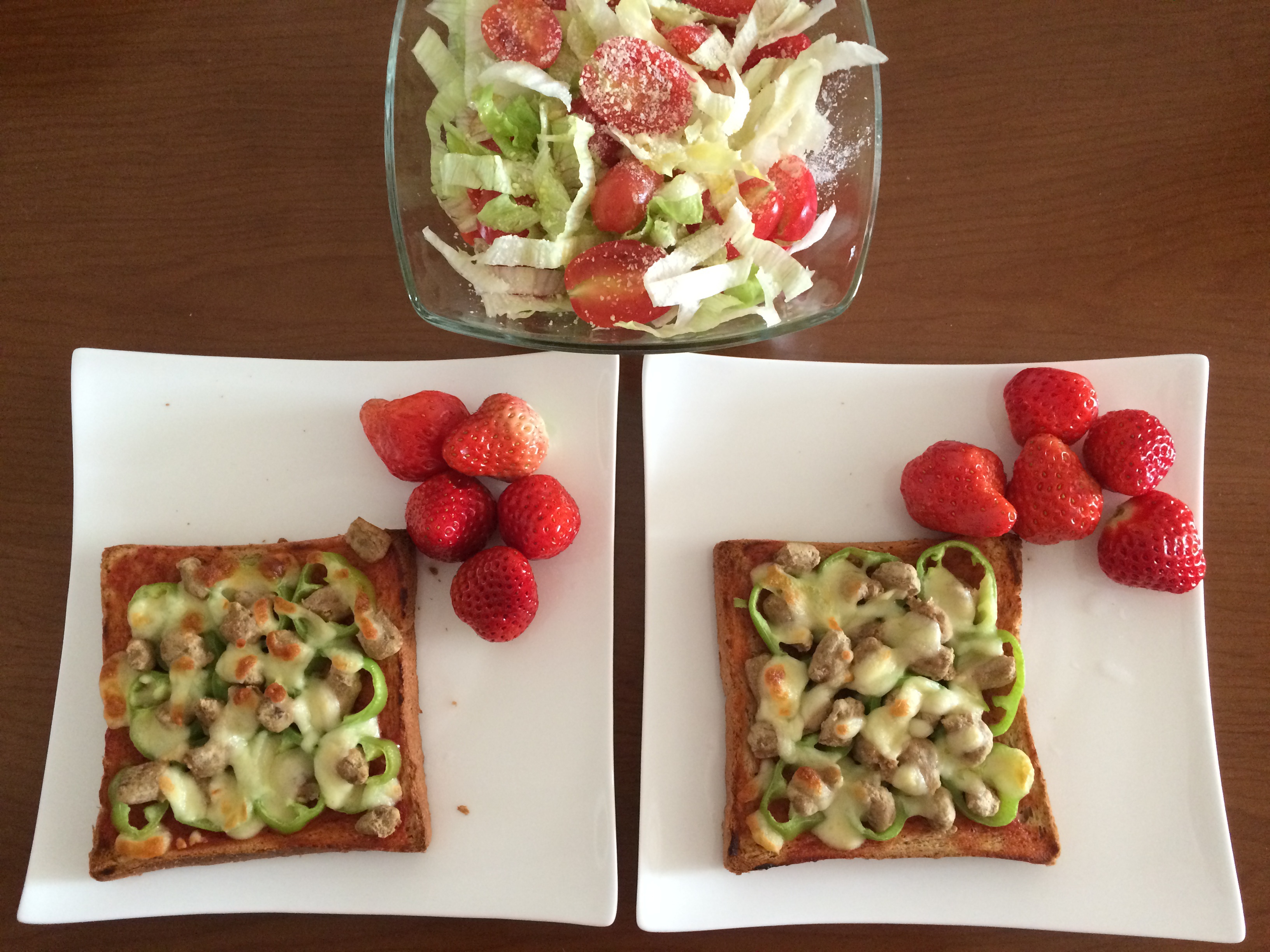 ,吐司披萨(辣椒、牛肉粒)、草莓、沙拉(生菜、圣女果、橄榄油、奶酪粉)
