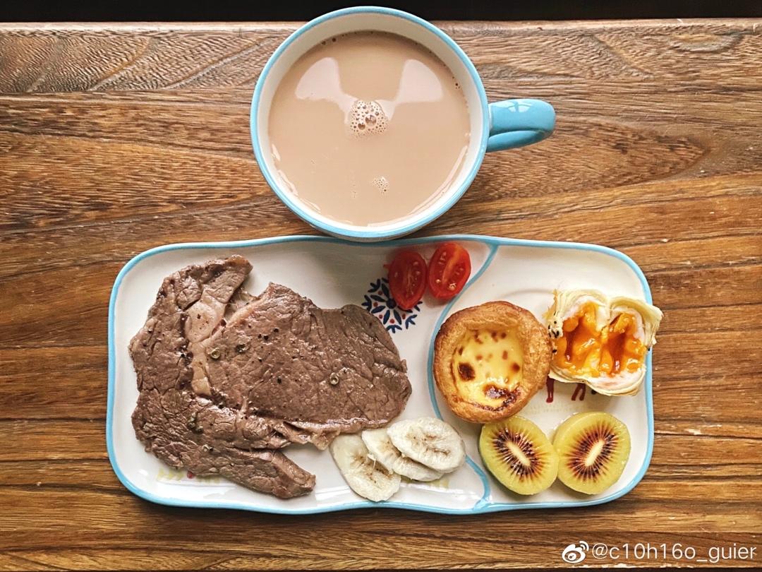 一人食:黑椒牛排🥩&红心奇异果🥝&抹茶黄油奶酥吐司🍞&a...