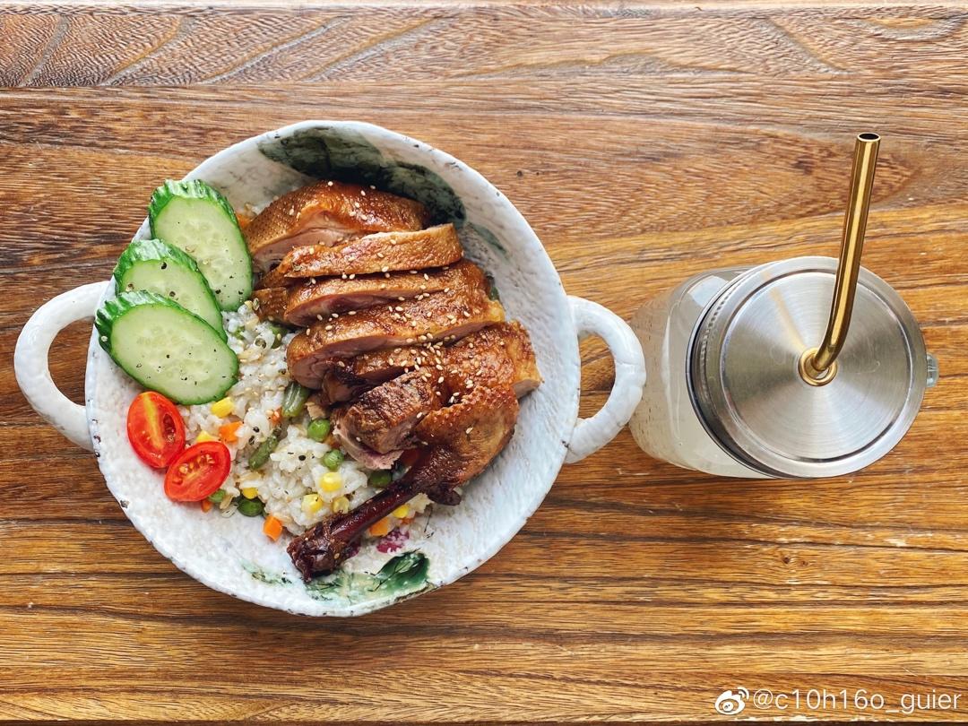 一人食:烧鸭饭&奇亚籽椰子水。