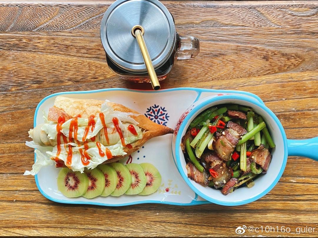 一人食:牛肠法棍热狗🌭️&红心奇异果&蒜苔炒腊肉&...