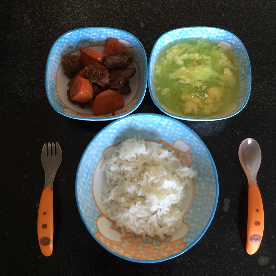 0204午餐:牛肉炖胡萝卜 黄瓜鸡蛋汤 米饭,少爷很给面子,三光了~