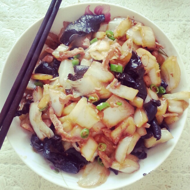 给爸爸做的 大白菜木耳炒肉,放了些糖和醋还有酱油,味道非常非常不错。对身体也很好