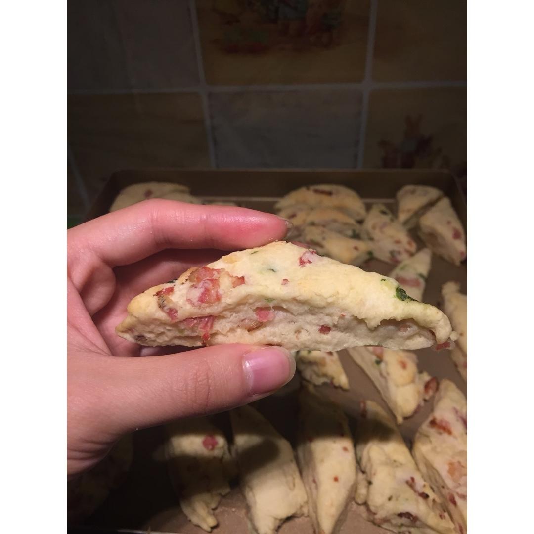 淡奶油培根香葱司康!完全是为了消耗一瓶开了挺久的淡奶油。。。没有称量,就是面粉和奶油混合到基本没干粉。我忘记加泡打粉了,...
