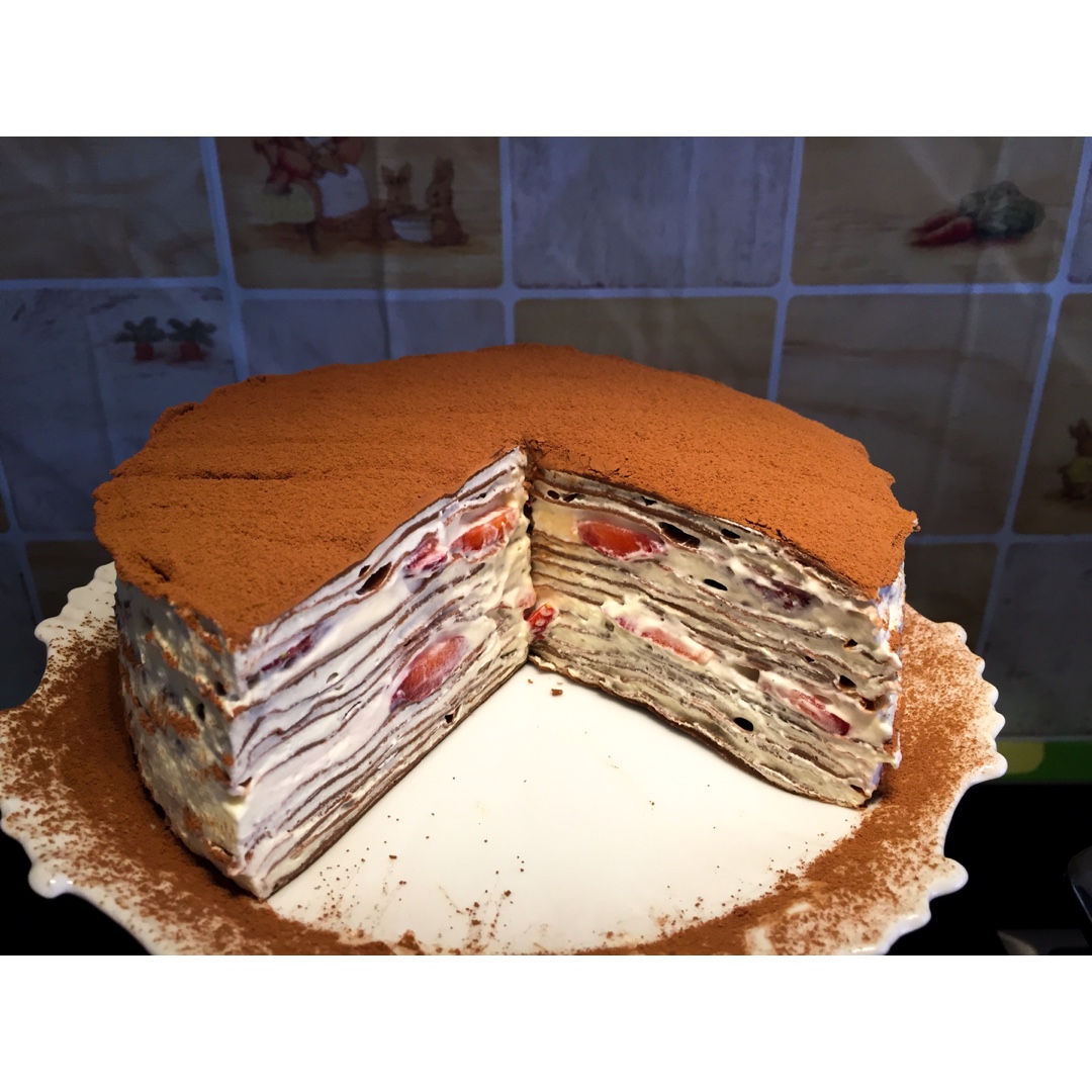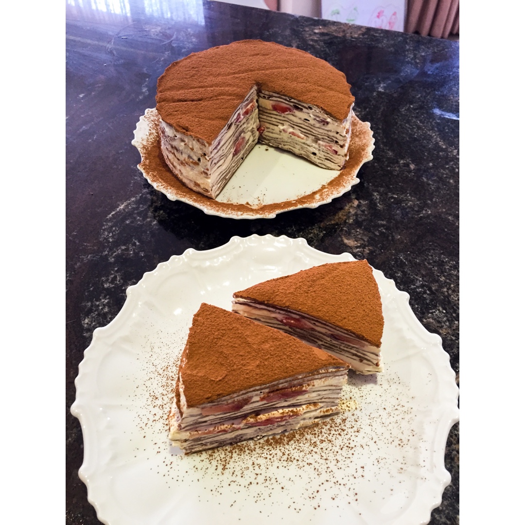 用的微博@甜猫记alice的巧克力千层的方子。面皮等比例换算成等比例3蛋做的,我家鸡蛋略大,最后感觉很稀又加了勺可可粉。...