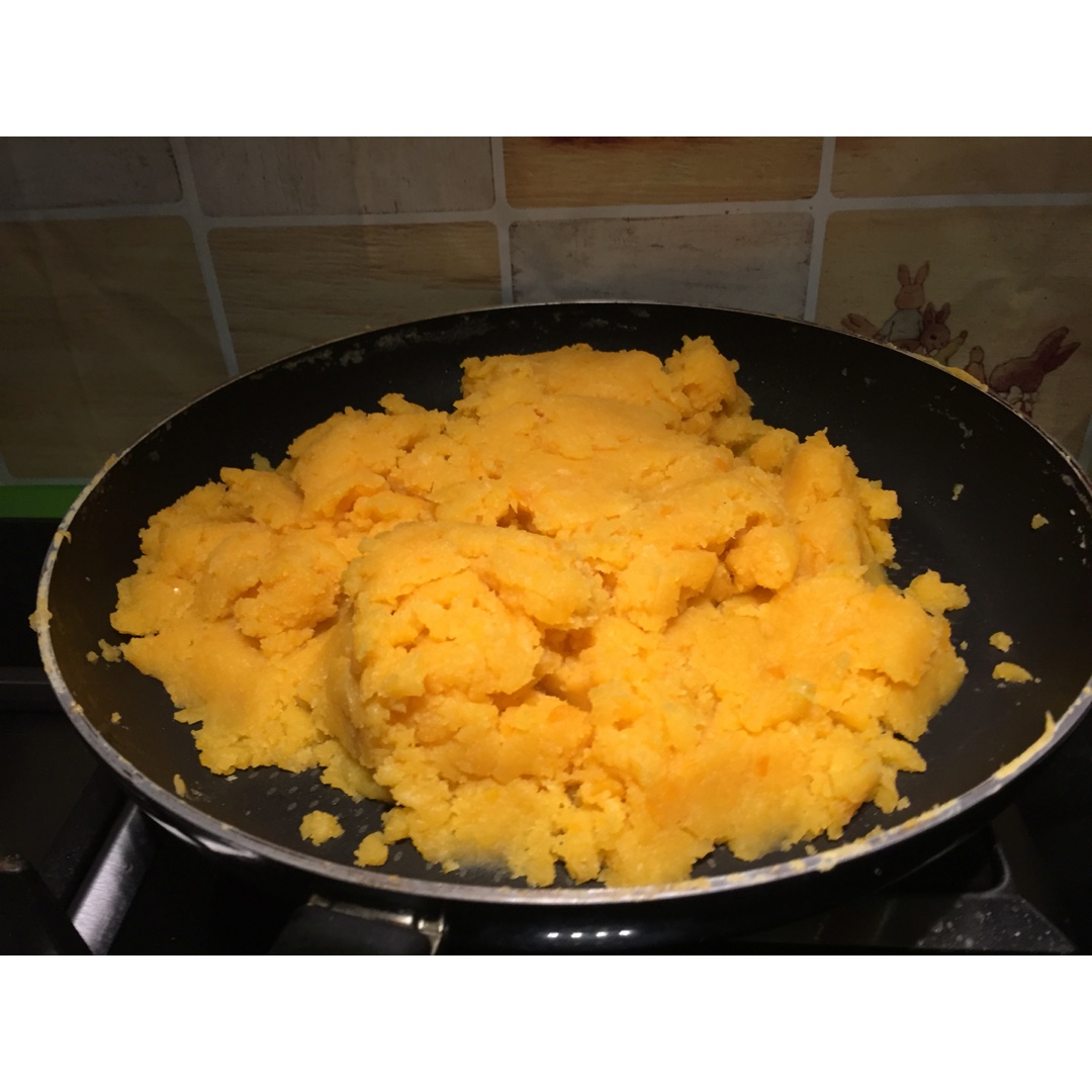 两倍量做的,放了12个咸蛋黄,糖略减放了160g。咸蛋黄不咸,所以还加了一点盐。感觉炒的有点太干,不过烤完觉得还可以。甜...