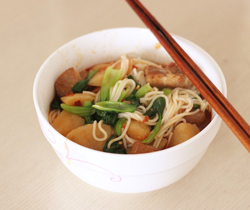 前天吃剩的排骨土豆做个盖浇面,最后浇头全吃完了,面剩下了……